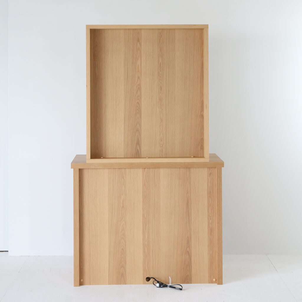 店舗なので一体で作ってもよいのですが、搬入などを考慮して上下で分割しています。大人二人で十分に運ぶことができる重量です。