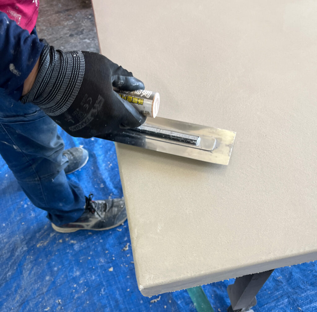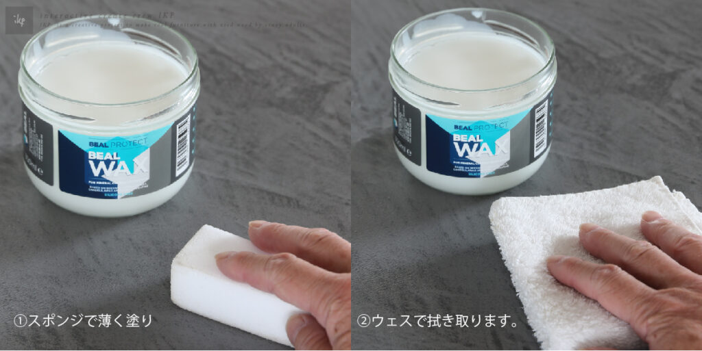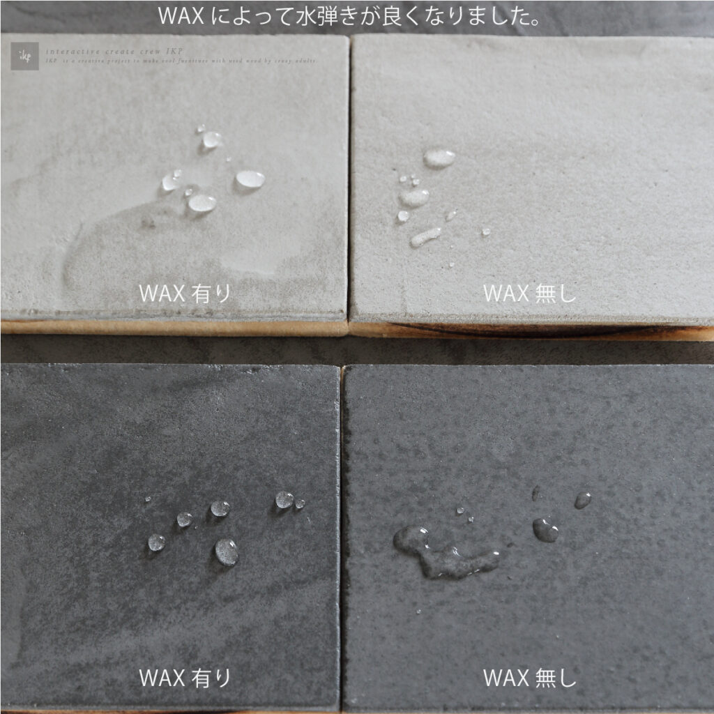 ワックスでメンテナンスすることで防汚性を高めることができます。モールテックスは汚れに強い素材ですが、色のついた液体などは染み込む可能性があるため早めの拭き取りが必要になりますが、ワックスを塗ることで浸透を遅くする効果があります。テーブルご購入の場合はぜひ一緒にワックスもオススメします。