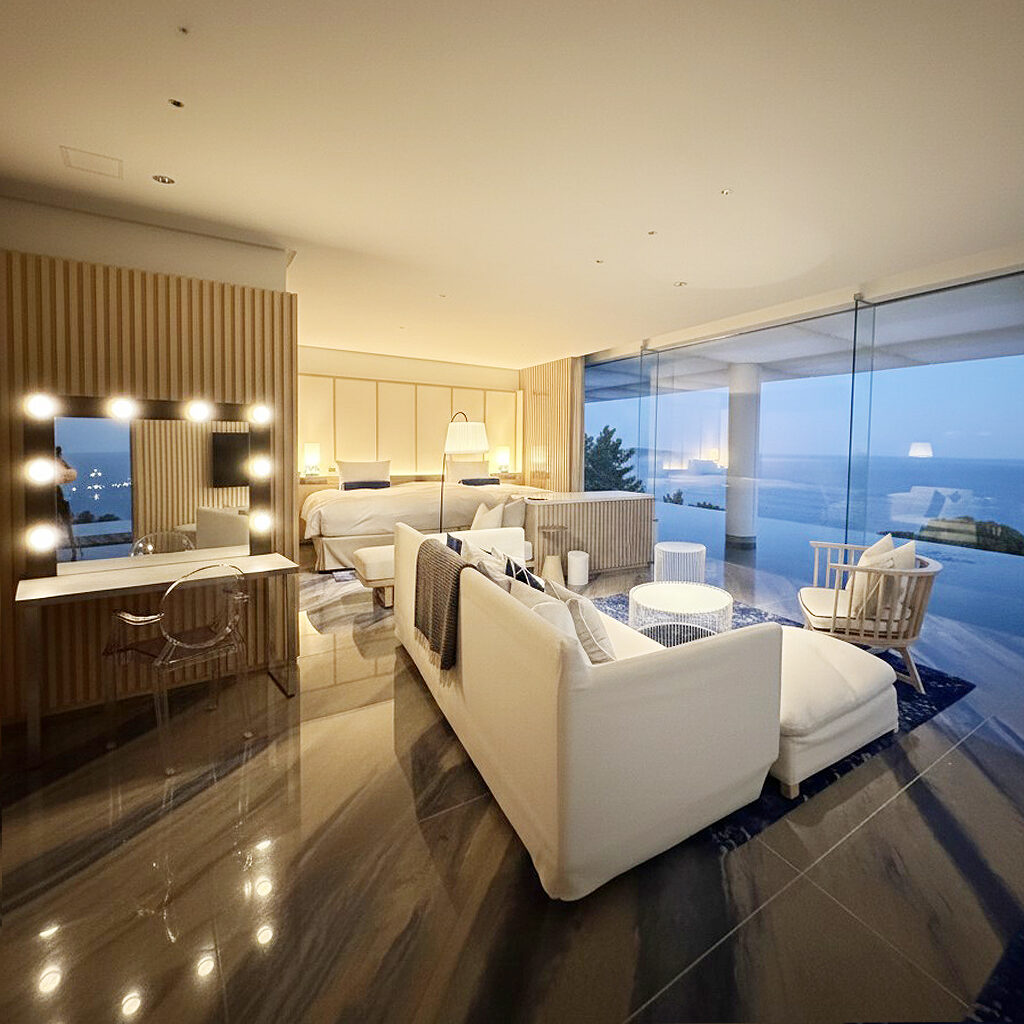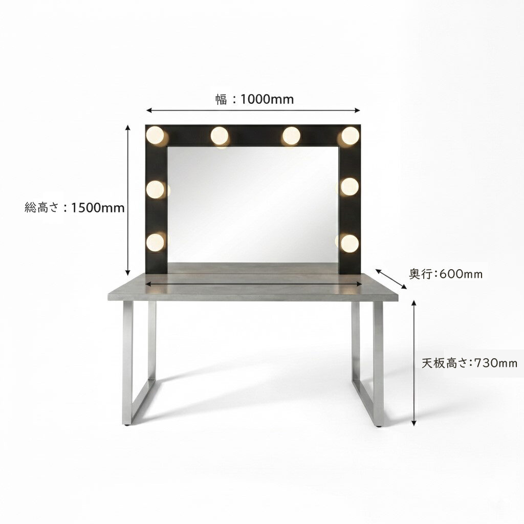 お客様が鏡に向かう瞬間を、最高のフォトジェニックな時間に変えるドレッサー。クールなグレーの天板と、重厚なブラックフレーム、そして眩いばかりの女優ライトが、映画のワンシーンのような特別感を演出します。