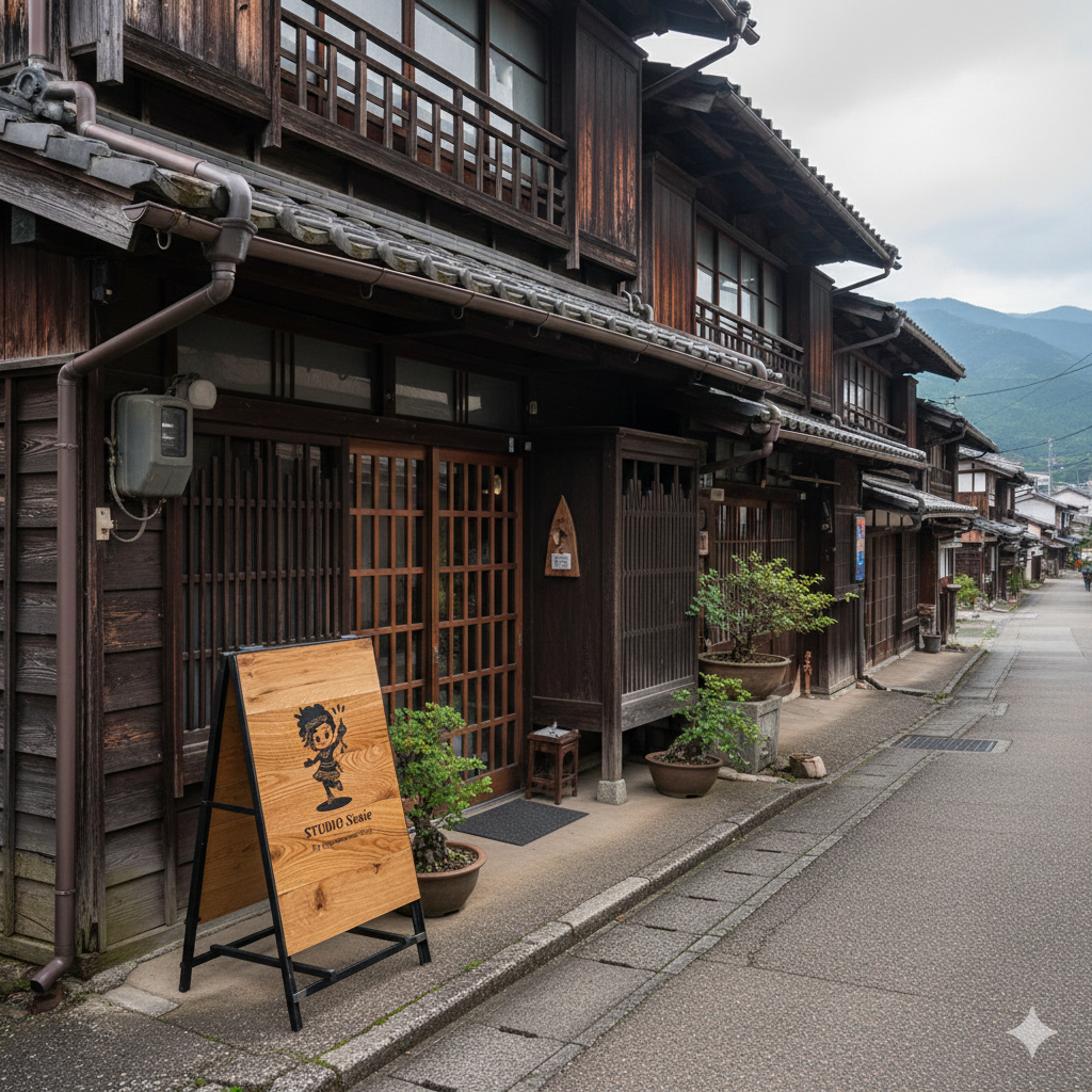 古い町並みの古民家の軒下でもマッチするデザインです。