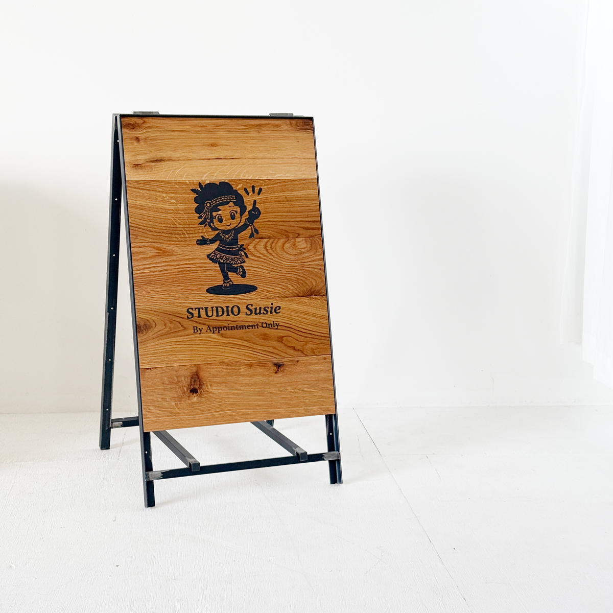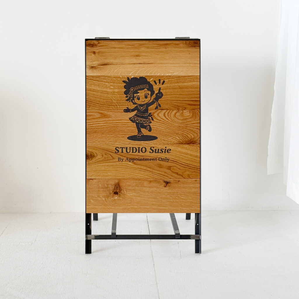 お客様からお預かりするデータを使って製作するショップ看板 アイアンフレームと木(オーク材)を使ってます。高さ750 幅400 板のサイズは高さ600ミリになります。