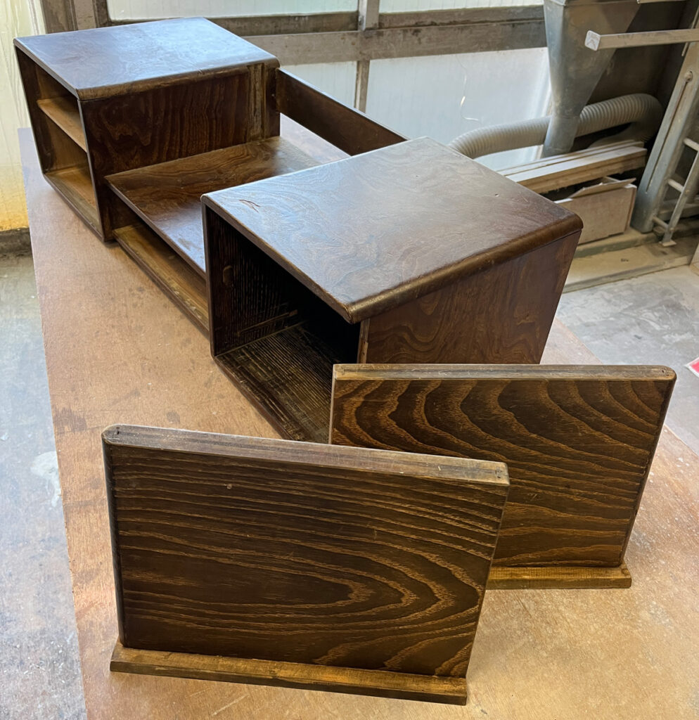 車で5分位の大変ご近所の方からの修理依頼。お母様が使われていた座鏡を新しくしたいとのことで引取させていただきました。色などはこちらで決めましたが、ライト付き、引き出しの中に仕切り板を追加してほしいというご要望です。