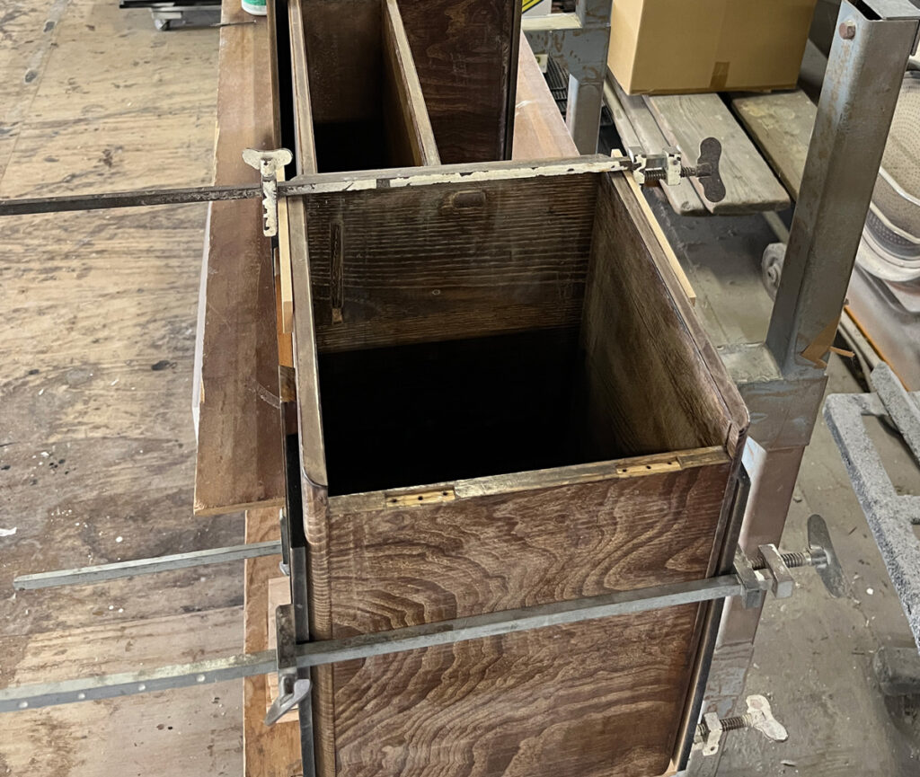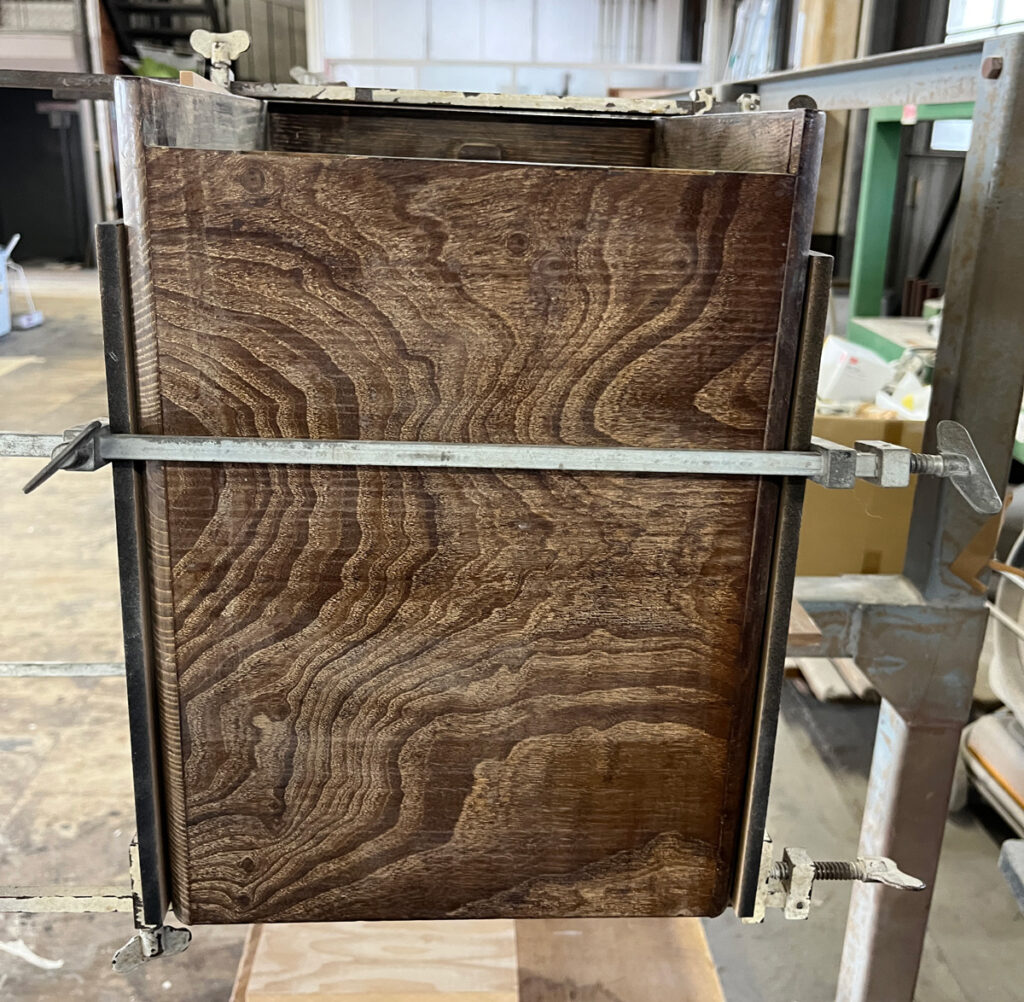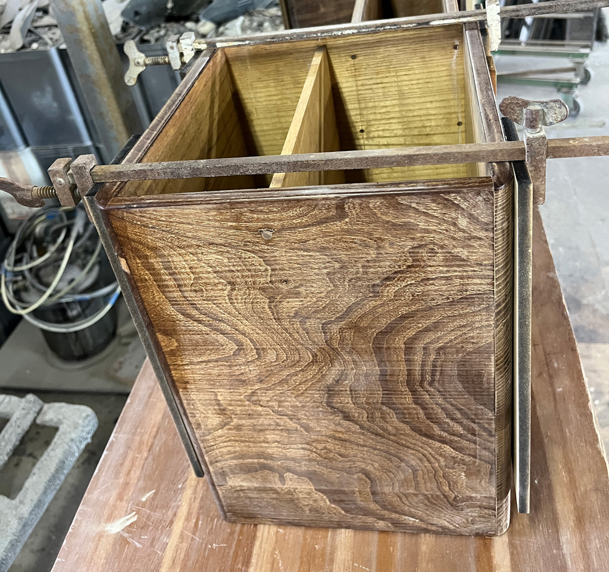 板の反りもあり天板が外れかけていたので、ボンドを入れてハタガネで固定します。